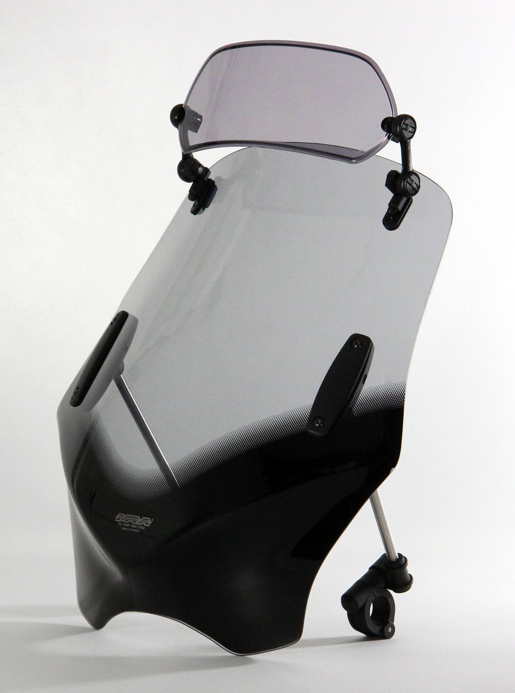 MRA plexi UNI V - Flow X - creen sport C kouřové. Ochrana proti větru. Spoiler je nastavitelný do výšky a do vzdálenosti od plexi. Plexi MRA UNI V-Flow X-creen sport C, délka 510 mm, šířka 400 mm, výškový rozdíl, barva kouřové. K plexi je nutné dokoupit montážní sadu HK. Certifikace ABE:Ano. Německý výrobce plexiskel s více než 25-ti letou tradicí. Specialista na motocyklové plexiskla. Použivaný materiál je speciálně modifikované PMMA. MRA vyrábí nástavce na plexiskla takzvané zvýšení, plexiskla tvaru racing, originál, spoiler a turistické. Specialitou je nastavitelné plexisklo Vario Screen. Na prvotřídní kvalitu spolehají jezdci Moto GP, Moto 2, Moto 3, Supebike, Endurance. Veškerý vývoj , výzkum a výroba probíhá u MRA. Výrobky jsou prodávany po celém světě. MRA je držitelem EN ISO 9001:2000.